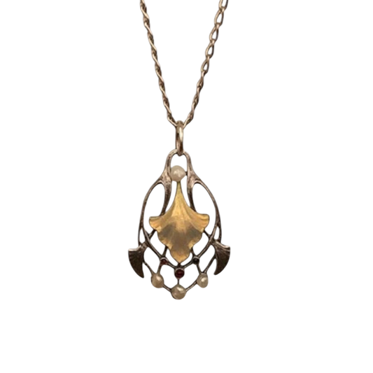 Art Nouveau Silver Necklace with Enamel Pendant, Rubies & Pearls